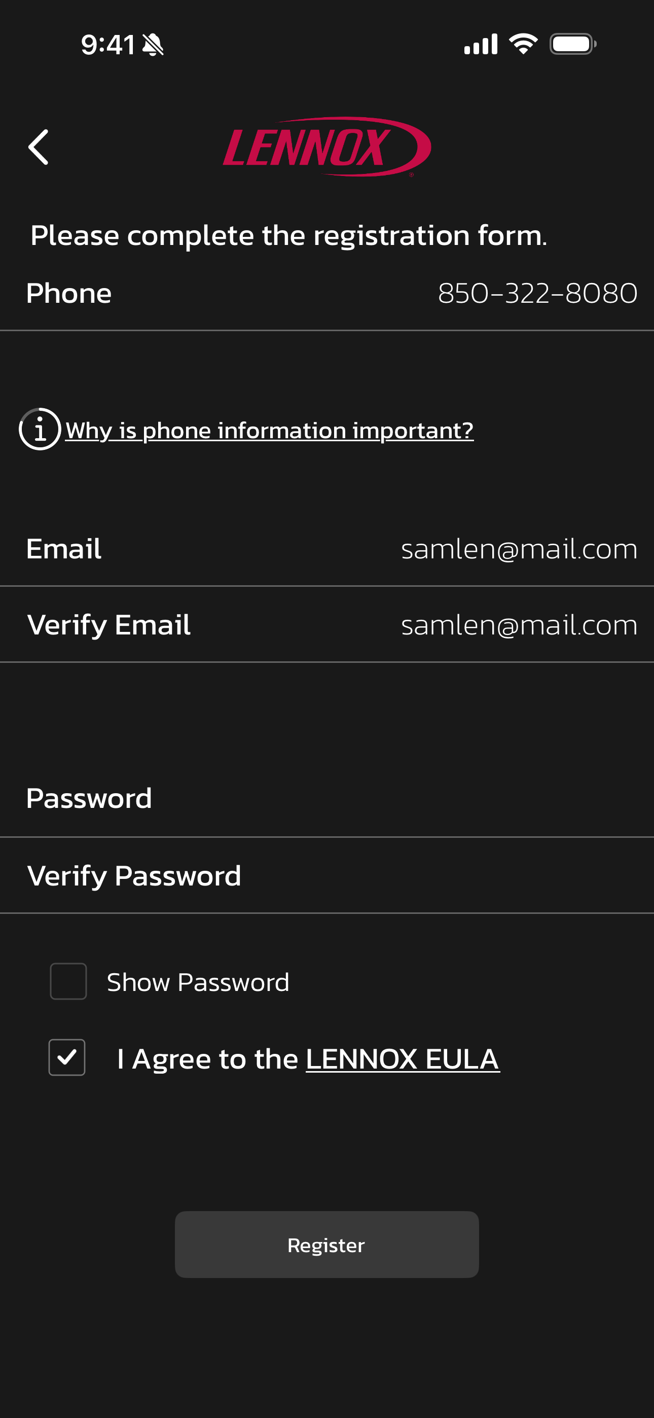 • Agree to the Lennox End User Licensing Agreement (EULA).