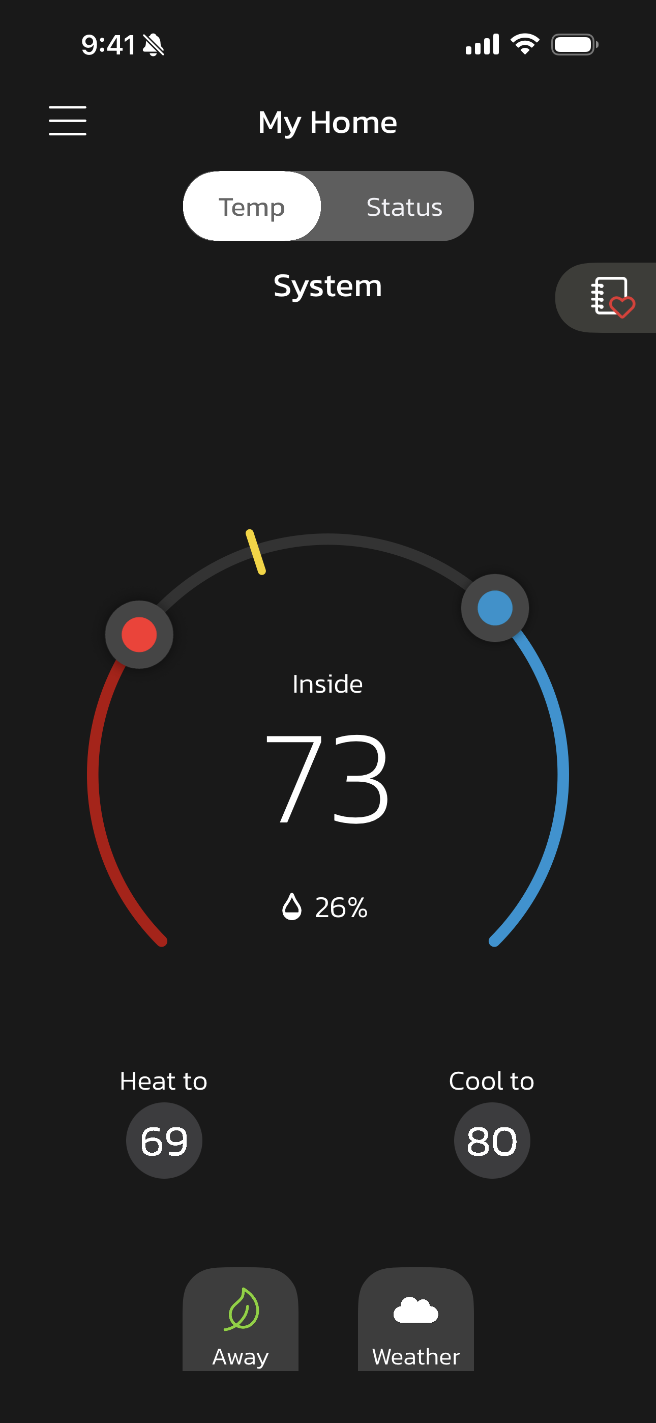 Away - When away from home, Smart Away when enabled is used to set the temperature while the home is unoccupied. Default low temperature setting of 62°F and high temperature setting of 85°F. Temperatures for any of the options above can be adjusted by sliding the low and high temperature circle left or right on the sliding scale.