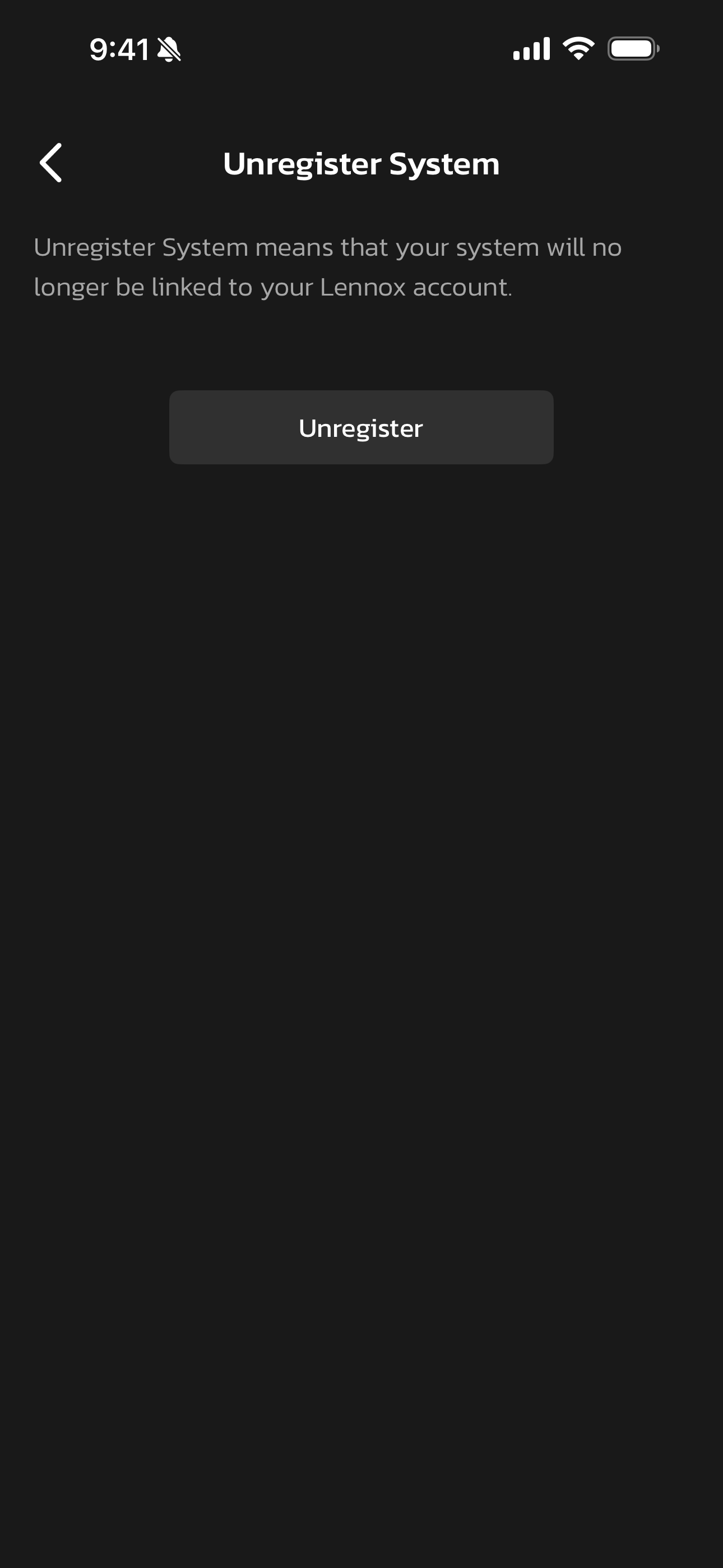 If you have moved into a home with an S40 that is still registered to the previous owner's account, you may re-register this thermostat after unregistering it first. To unregister, go to Menu > Settings > (Advanced Settings) Unregister System > Unregister and select Yes. Now you will be able to re-register the device to your account.
